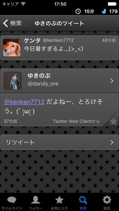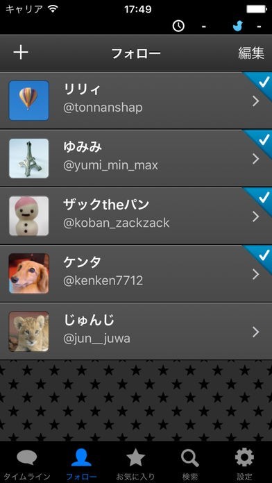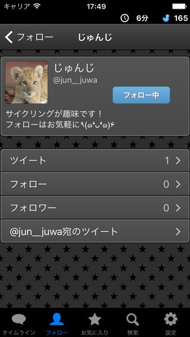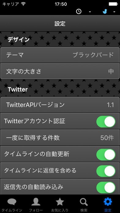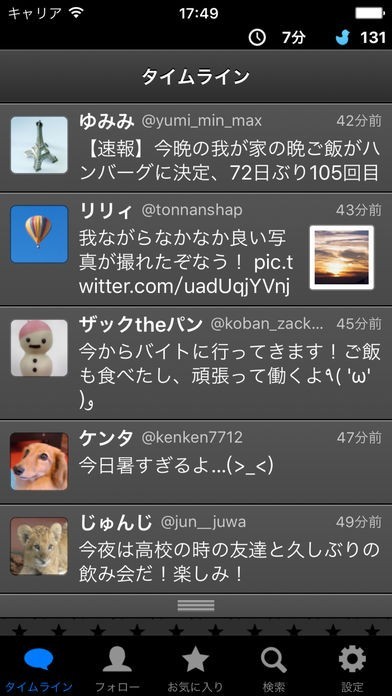 アプリ内でタイムラインの自動更新やフォロー、お気に入りなどの機能がある
