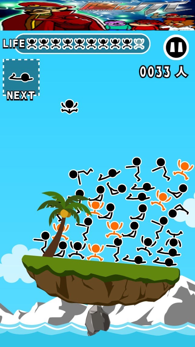 グラグラと揺れ動く島の上に何人棒人間を乗せることができるかを競うゲームです。タップして離すと棒人間島に落ちてきます。タップしている長さが長いほど棒人間は大きくなっていきます。棒人間の体勢もそれぞれ異なり、オレンジの棒人間を周りとくっついてしまいます。様々な条件を考えてバランスを取っていかなければなりません。 10人が島から海に落ちてしまうとゲームオーバーになります。島に残ることができた最高人数の世界ランキングも用意されています。