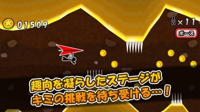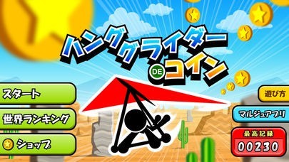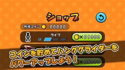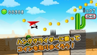 「ハンググライダーでコイン」は直感的な操作でハングライダーを操ってコインをとりまくるアクションゲームアプリになります。操作方法はiPhone本体を傾けることでハングライダーの方向を変えることができるようになっていて、画面に左をタップすると減速、右をタップするとスピードアップすることができるようになっているので、上手にハングライダーを操ってステージに存在しているコインをたくさん集めることが目的となっています。集めたコインはコインショップで急ブレーキやコインの吸引が可能なアイテムと交換することができるようになっているので、どのアイテムと交換するかが攻略のポイントになります。