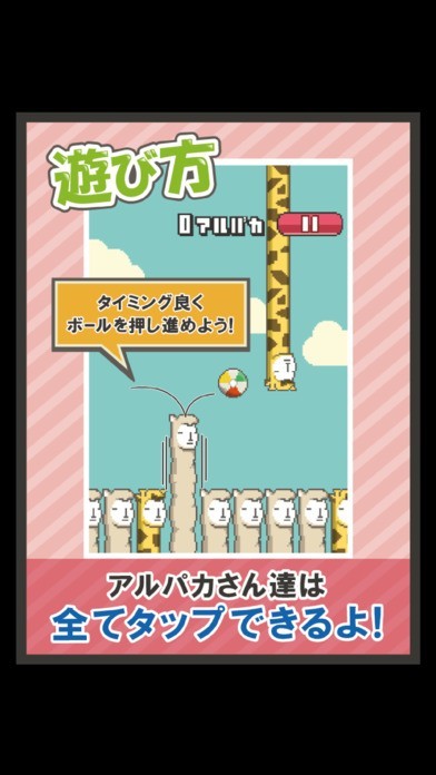 「のばして!アルパカ」は、アルパカの首を伸ばしてビーチボールを転がしていく、のほほんとしたアクションゲームです。 ゲームを始めると、沢山並んだアルパカの首の上にビーチボールが転がっています。アルパカの首をタップして上に伸ばし、ビーチボールを飛ばしながら前に転がしていきます。 アルパカはどの個体をタップしても大丈夫です。 ビーチボールを飛ばせずに、潰してしまったらゲームオーバーです。 上に「〜アルパカ」と点数が表示されており、白いアルパカなら1アルパカ、キリン柄なら5アルパカといった具合に加算されていきます。 途中様々なアルパカが待ち構えており、ユニコーンアルパカはビーチボールを割ってしまう等、キャラの特性を見極めながら進めていく事が重要です。