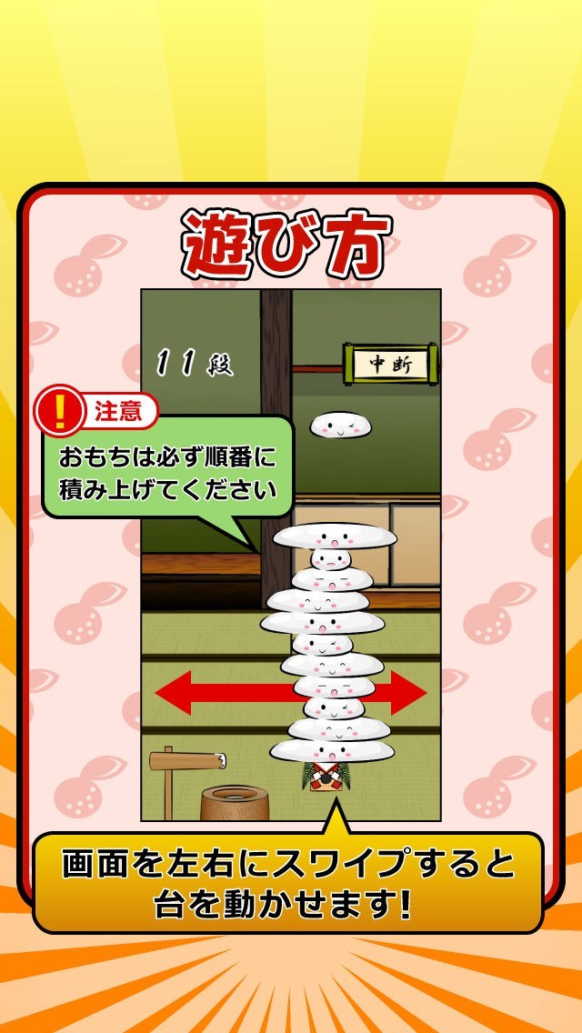 あなたは餅つきが大好きであり、できる事ならスマホのゲームでそれらを体験したいと思っています。餅をどんどん重ねて言って、天井にまで届くようにすれば一人前の餅つきマスターです!