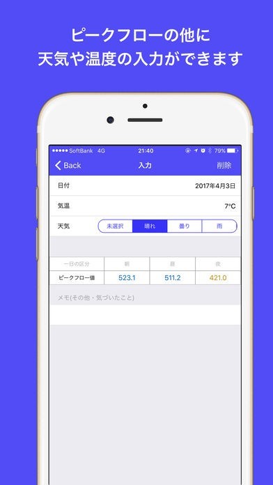 App Storeより引用このアプリはぜんそく・ピークフローの値を毎日記録するための日記です。