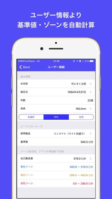 ・自己ベストのピークフローから、自動でゾーンを判定