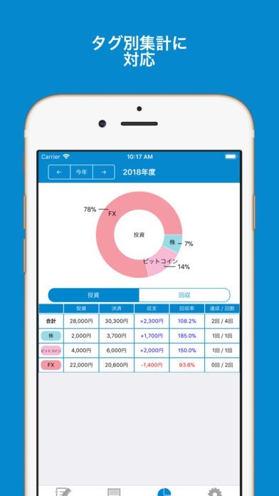 FXや仮想通貨の収支を円グラフでチェック出来るようになっています。また投資した金額や利益等をまとめて表示させることが可能で、タグ別に情報を集計出来るのが利点でしょう。
