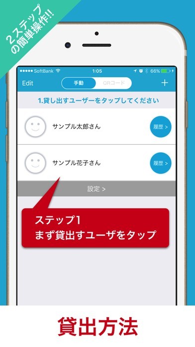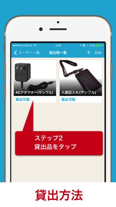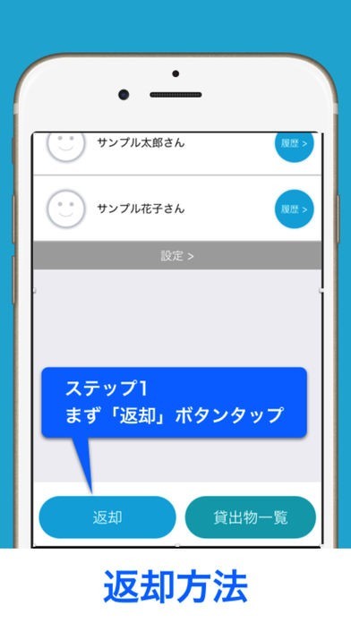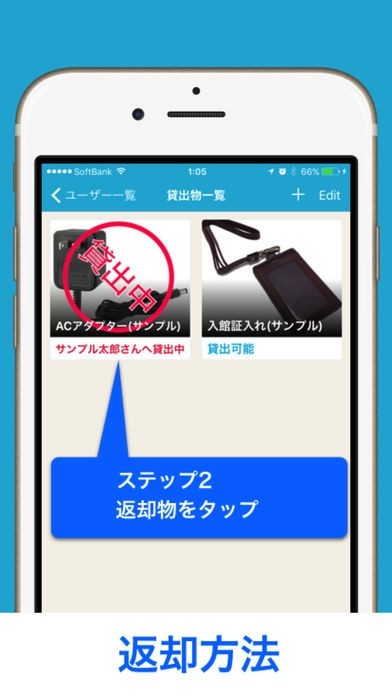 貸し出しを行う際には、貸し出すユーザーをタップし貸出物一覧から貸し出し物を選択します。2タップだけで操作は完了します。返却時は、返却ボタンと返却物をタップすると完了します。