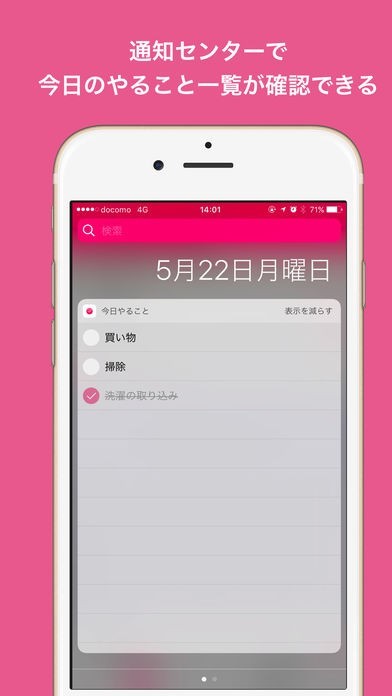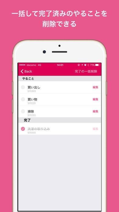 やることリストの項目は自分で自由に設定できる他、できた項目については一括削除も可能です。やることを日付に区切って登録できる上、お知らせ機能がついているのでタスクのやり残しがありません。