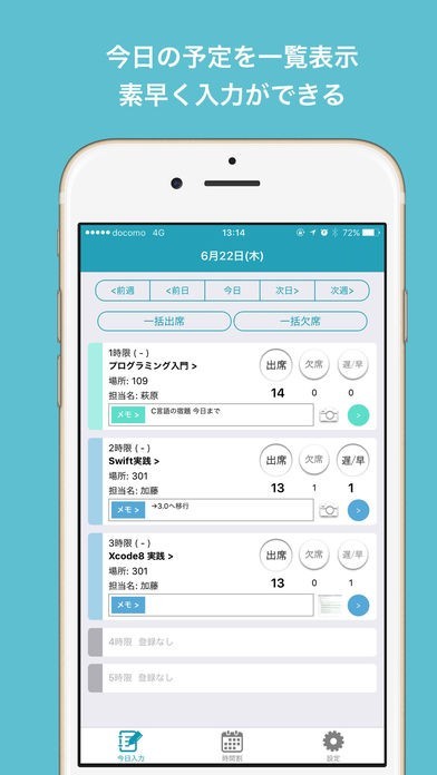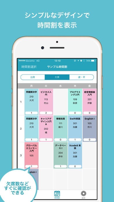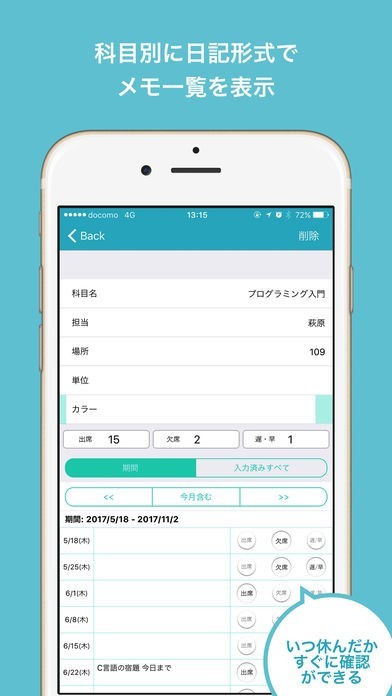 出席や欠席、遅刻や早退をワンタップ操作のみで選択して記録しておいて全ての集計を取ることができます。時間割表にも欠席日数が科目ごとに表示されています。いつ欠席したのか履歴も残せます。