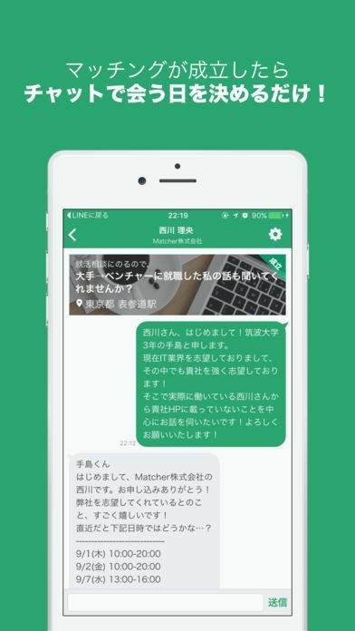 学校名や年齢等の条件に左右されずにOB訪問の予約が行えるようになっています。チャット機能が用意されているので、マッチングした社会人と気軽に日時の打ち合わせが行えるのも利点です。