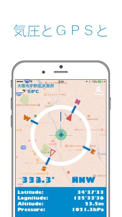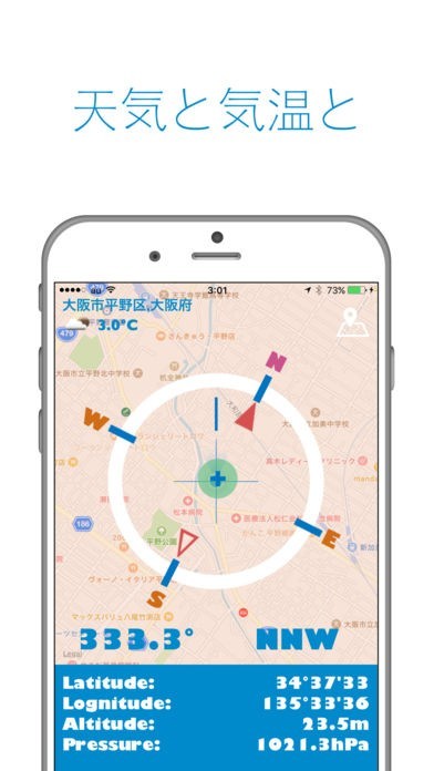 現在地や地図はもちろん、経度・緯度や気圧といった詳細な情報まで知ることが出来ます。