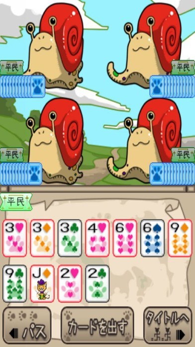 RPGのようにフィールドやダンジョンなどを探検できます。敵と出会った場合は、基本的に大富豪で対戦することになります。敵はカタツムリなどユニークなキャラクターが多いです。