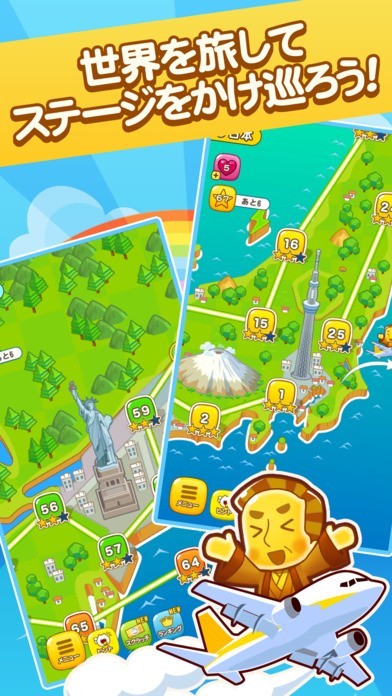 同色のコインをなぞって資金を集めていける「パズ億~爽快パズルゲーム」は消した数に応じてどんどんスコアを高めていけるパズルゲームで、世界地図をモチーフにしたステージに挑戦出来る特徴があります。コインを集める度にチャリンと音が鳴るので爽快感を感じながらお金を集めていけますし、可愛いマスコットやキャラが登場するので子どもと一緒に楽しくプレイ出来るのが機能の魅力でしょう。ステージによってプレイ回数やノルマの上限が異なるため、パズル等の頭を使うコンテンツが好きな人に最適なゲームとなっています。またマップを通して日本だけでなく様々な国の地理にも詳しくなれます。