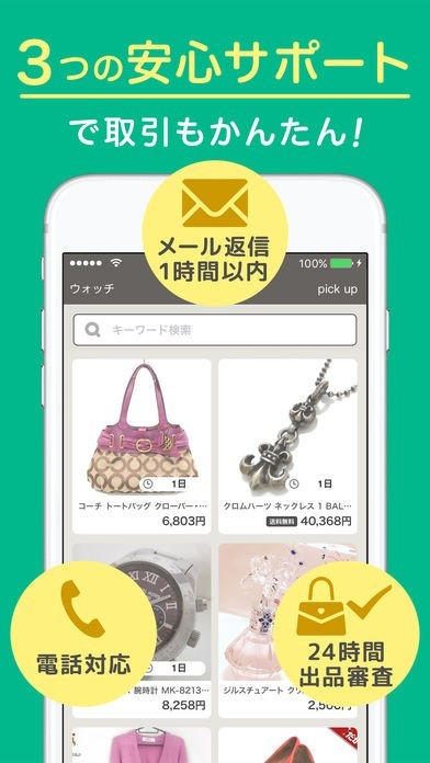 「モバオク」は出品数200万点以上のファッションから家電製品まで幅広いジャンルのアイテムを取り扱っているオークション&フリーマーケットアプリです。お金のやり取りに関しては運営が仲介してくれるので安心して取引ができるだけでなく、日中であればメールでの質問に1時間以内に返信してくれたり、サポートが電話でもチャットでも対応してもらえるといった安心して利用できるアプリとなっています。欲しいアイテムのキーワードやお気に入りの出品者を登録しておくことで出品された際にアラートでお知らせしてくれます。