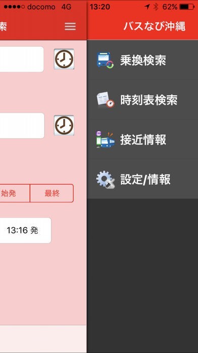 沖縄でバスをよく利用される人はこの「バスなび沖縄」アプリを使ってみてはいかがでしょうか。乗り換え検索は出発地から到着地までのルートを探してくれて、始発と最終便の時刻だけを表示してくれるので、時間を忘れてうっかり乗り遅れることもありません。時刻表検索ではのりばを入力すれば全ての便の一覧を見ることができます。また接近情報は同様に使い方は同じで、リアルタイムに後何駅で到着するか運行状況が分かる機能で、のりばだけでなく施設や現在地からも検索できるので便利です。