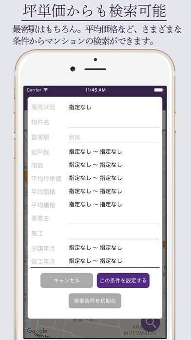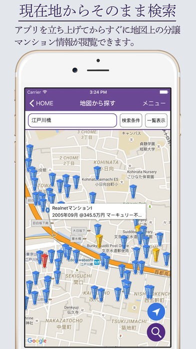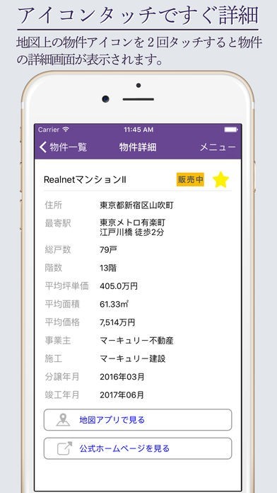 現在地やキーワードで検索し、電子地図上にその場で表示。既に販売されているマンションデータはもちろん、販売予定や現在販売中の物件の最新情報まで閲覧可能。マンションの公式ホームページへのアクセスもそのままできますので出先からの情報チェックもカンタンです(※公式ホームページが存在する場合のみ)。
