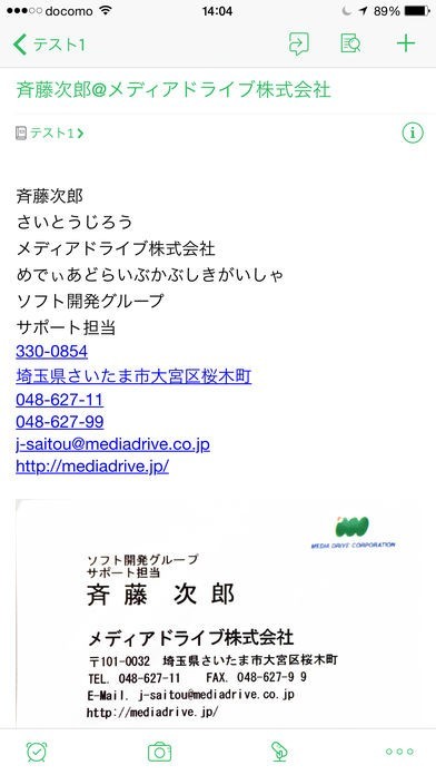 「文字認識」機能が搭載されていて、名刺に記載されている名前や電話番号等を自動で判別してくれます。また識別した内容をメモに貼り付けたりテキストとして編集出来るので、取引先の補足情報を追加したい時に役立ちます。