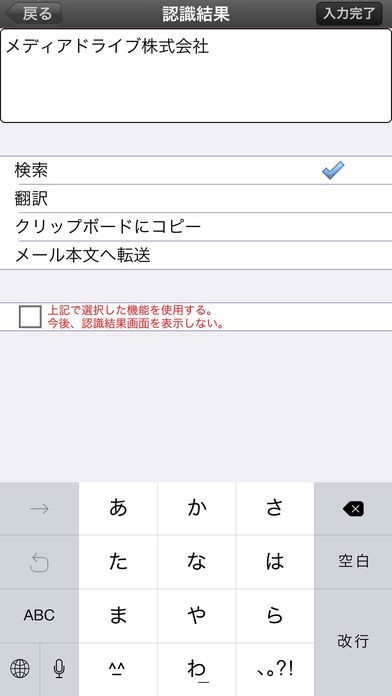 読み取ったテキストを保存しておくためのメモアプリ呼び出し機能が搭載されています。メールアプリを呼び出すこともできるので読んですぐに送信することも可能です。手間を省いてビジネスを円滑にしていきましょう。