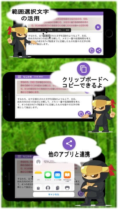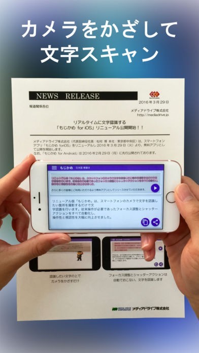 「仕事先でもらった名刺の漢字が難しくて名前が分からない」 「参考書に書いてある文章をスマホに保存したい」 「この英単語の意味を調べたい」 そんな時に便利なのが「もじかめ」です。 このアプリは、気になる文字をカメラ型のOCR機能を使って簡単にスキャンすることができます。 そして取り込んだ文章は、クリップボードにコピーしたり検索して意味を調べることができます。 カメラをかざして、文字認識さえできれば、誰でも簡単にスマホに取り込むことができます。