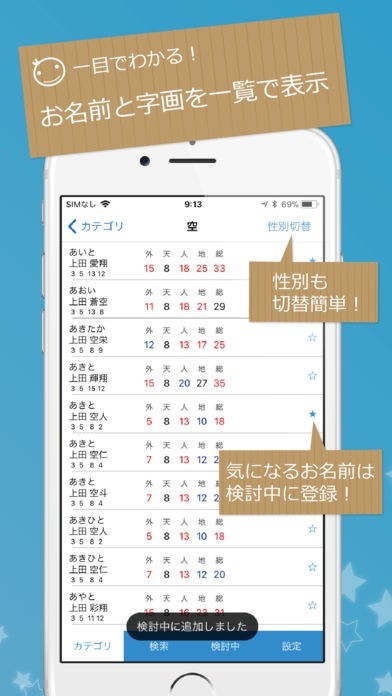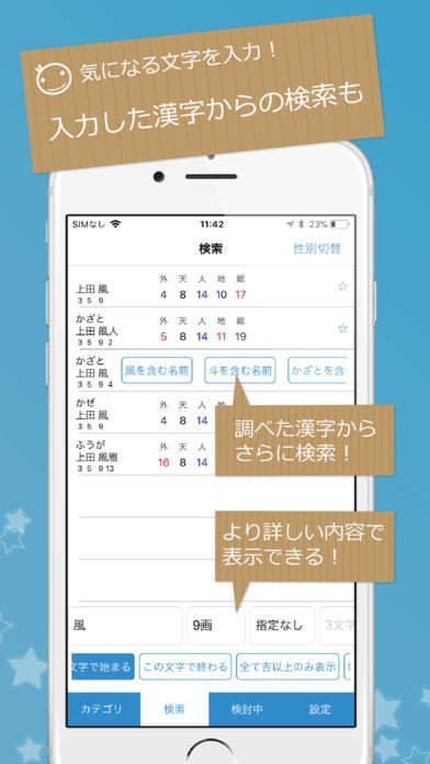- 名前をタップするとその感じを含む名前の検索や、漢字の意味を検索できます