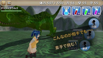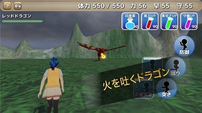 「素手でドラゴンを倒す少女」は、3D視点のアクションゲームです。ミニスカニーソの空手女子が素手でドラゴンに挑む、というシュールな設定ですが、ワイバーンやティラノなど多彩なドラゴンも魅力となっています。さらにパンチ連打という単純なアクションではなく、通常の突き・蹴りのほか正拳突きや二段蹴りといった必殺技を繰り出すことも可能です。ピンチのお助けアイテムも用意されており、戦闘中は回復薬のほか、筋力、素早さ、守備アップの各ポーションが利用できます。また、稽古モードで成長させることができ、やり込み要素も盛り込まれています。