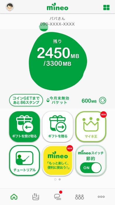 mineoはMVNOまたは格安SIMとして広く知られるサービスで、「mineoアプリ」の利用には契約ユーザーのIDとパスワード入力が必要です。従来のようなパケット使用量や料金の確認だけではなく、コミュニティサイトのマイネ王へのログイン、節約モード(通信速度制限)の切り替えが可能なmineoスイッチもワンタッチで設定できます。また、ウィジェットやプッシュ通知機能にも対応しています。