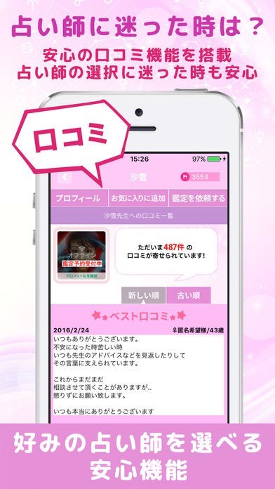 他のユーザーの口コミにも目を通すことが出来るのも安心ポイントの一つとなります。占い師やコースに迷った時にも、参考として使う事が出来るので、特に初心者にはおすすめです。