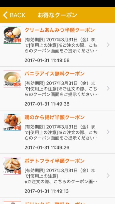 「久兵衛屋アプリ」で配信されているクーポンは唐揚げの値段が半額になったり、バニラアイスが無料になったりとお得感の強いものばかりです。家計を助けてくれるクーポンが目白押しです。