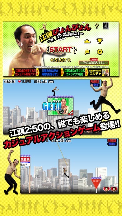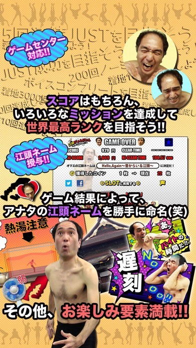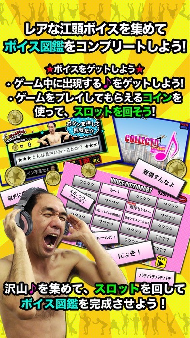 「江頭ぴょんぴょん」では、エガチャンを操作してバイト先まで無事に到着させる横スクロールアクションゲームアプリです。遊び方はいたってカンタンで、アプリを起動したらスタートを押すとゲームが始まります。道端に落ちているコインを集めつつ、エガチャンを無事バイト先に到着させましょう。また、ミッションをクリアしていく事でもGETすることが出来ます。集めたコインはスロットを回転させるのに必要で、景品はエガチャンのオリジナルボイスが獲得できます。獲得した超えは図鑑からいつでも聴くことが可能です。