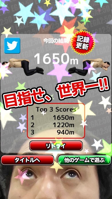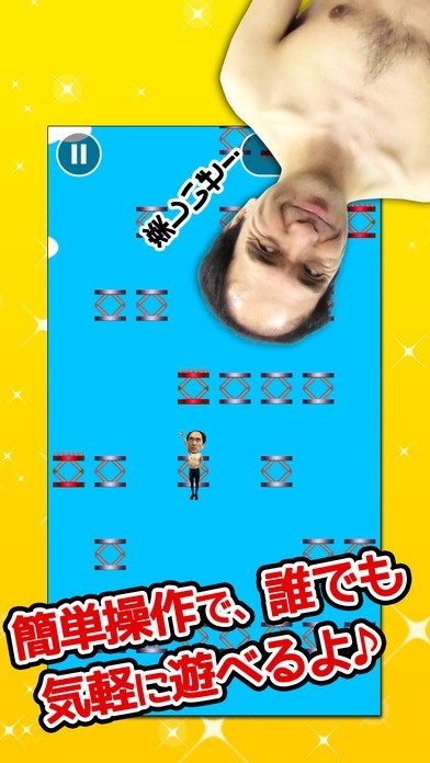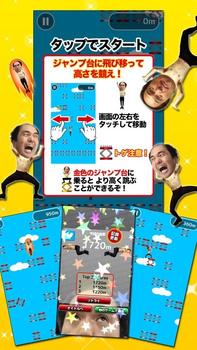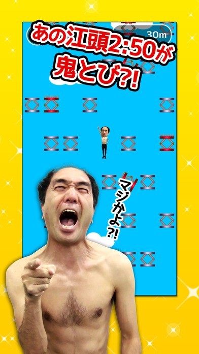 人気アプリであった鬼とびの江頭2:50バージョンになっています。江頭2:50をできるだけ高く飛ばすようにしましょう。画面の左右にタップしていきますと江頭2:50が動くことになります。長押しをしますと移動していきます。ジャンプ台を飛んでいき、より高く目指すようにしましょう。とげのジャンプ台を踏んでしまうとゲームオーバーになります。画面から消えてしまってもゲームオーバーとなるので注意しましょう。そして、金の台に乗ると一気に強く飛ぶことができます。