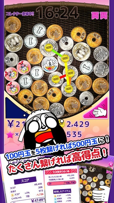 ・高い硬貨をできるだけ多く繋げて消すと高得点を獲得できます。