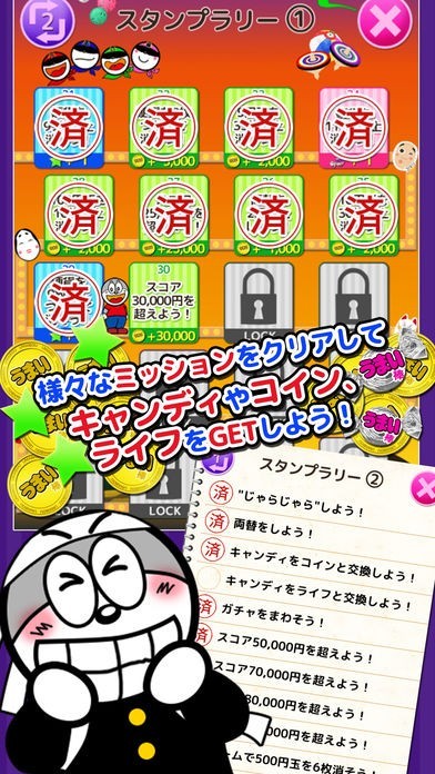 様々なミッションをクリアすると、キャンディ、コイン、ライフ等を獲得できます。