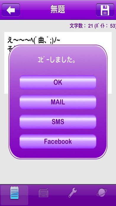 - メール/SMSや、facebookに貼り付けるために、便利なボタンも実装されています。