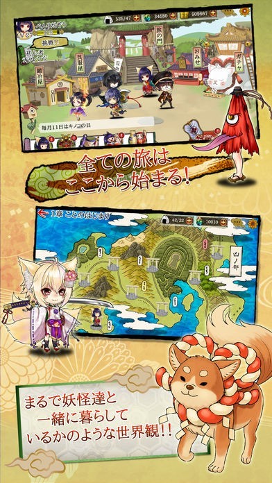 妖怪たちが住む妖怪横丁をイメージしたホーム画面でかわいいキャラたちがお出迎え。