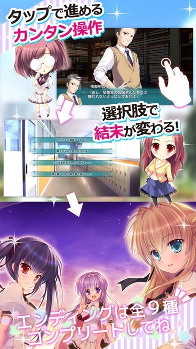 ゲームの途中には選択肢が多数散りばめられており、あなたの選択に従ってストーリーは分岐していきます。エンディングは全部で9種類。どのヒロインを選ぶかはプレイヤー次第です。