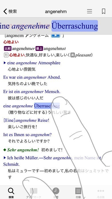 操作はアプリの画面をなぞるだけ。用例を簡単にブックマーク登録できます。