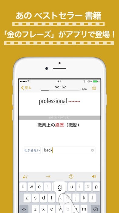「金のフレーズ1」は、TOEICで出題される英単語が、効率よく覚えられる英語の学習アプリです。 学習は3つの段階に分かれており、まずは英単語をフレーズごと目で見て暗記するところから始めます。 目から理解したあとは音声再生でリスニングの特訓をし、最後に穴埋めテストでしっかり暗記できているかをを確認しましょう。 このような学習ステップで、記憶した単語を忘れてしまわないよう工夫されているのが特徴です。 英語をしっかりマスターしたい方、TOEICを受験する予定の方におすすめのアプリです。