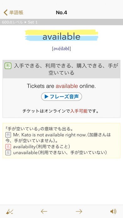「金のフレーズ 2」は、英単語の習得に最適な学習アプリです。 朝日新聞出版発行による書籍「TOEIC® L&R TEST 出る単特急 金のフレーズ」を収録しており、1000フレーズが学べるのが嬉しいポイント。 それぞれのフレーズには見出し英単語や訳文フレーズなどが添付されているため、意味をしっかりと把握しながら覚えることができるようになっています。