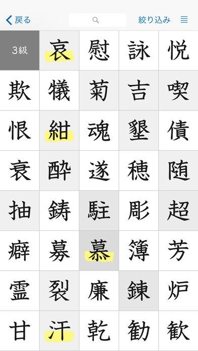 ・漢字を確認する毎にタイルが黒くなっていく使い込み度表示