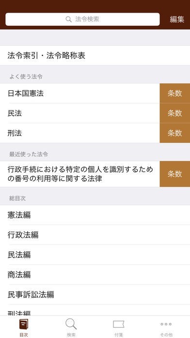 ・五十音の法令索引を目次画面の一番上に配置し、素早く法令を見つけられるようにしました。