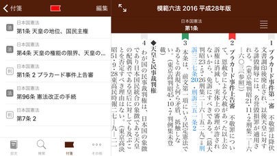 「模範六法 2016 平成28年版」では、模範六法の特徴である新旧条文の比較や判例要旨、参照条文の確認に便利なプレビュー機能、素早く目的の条文を表示する法令検索機能等を搭載し、前年2015年版よりアプリを一新いたしました。プレビュー機能は2014年版ではiPadのみに搭載していた機能ですが、iPhoneでも利用できるようにし、別画面でのプレビューとすることで内容の比較が可能になりました。法令検索機能では目次画面のトップに検索フィールドを配置し、起動してすぐに目的の条文を検索できるようになりました。たとえば「憲11」で検索すれば「日本国憲法 第11条」がヒットし素早くジャンプできます。