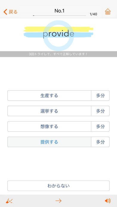 「ランダム出題機能」を使うことによって、出題順をランダムにして使うことが可能となります。単語の定着度を少しでも上げたい時には、非常に役立つ学習機能となっています。