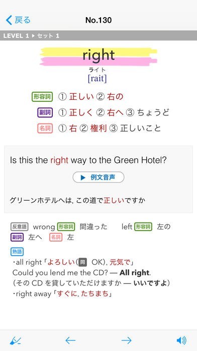 各英単語・語義ともに、音声で読み上げてくれる機能が使えるので、難しかったり覚えにくいフレーズも、発音をしっかり確認した上で、学習を進めることが出来るようになっています。