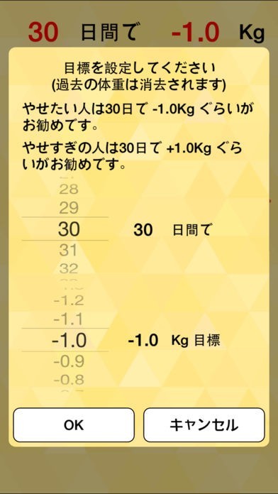 毎日体重を入力する事で、あなたの普段の食事量や運動量をどれだけ変化させれば良いか目安が分かります。あとはその目安に沿って、生活していきましょう。大切なのは体重入力を続けていく事です。