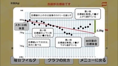 このアプリは、目標体重と期間を入力するだけで、どのくらいのペースで体重変化をさせていくべきかをグラフ化してくれます。さらに、毎日の体重入力で目標に近づけるためにその日の食事量や運動量をどう変化させていくべきかを教えてくれます。