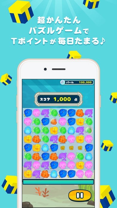 Tモールの中のゲームの一種で、海をモチーフにしたカラフルなパズルです。ゲームをすればTポイントを貰えます。また、ゲーム以外でもくじ引きが用意されていてTポイントをゲットできます。