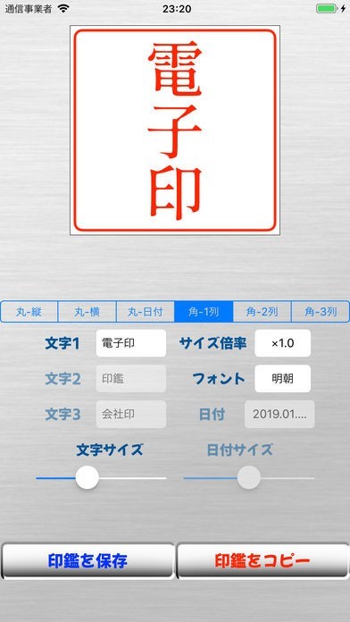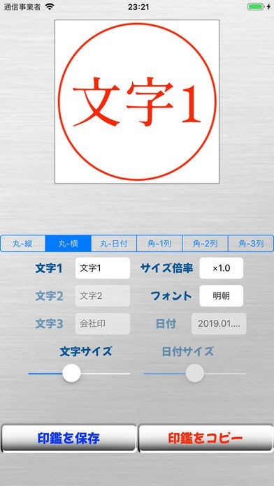 App Storeより引用1. 「丸-縦」,「丸-横」,「丸-日付」,「角-1列」,「角-2列」,「角-3列」の6種類から作成したい印鑑種類を選ぶ。