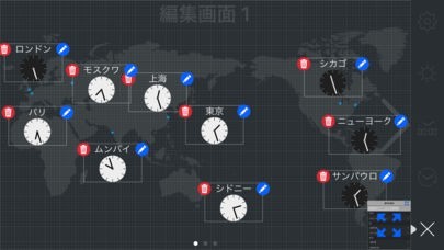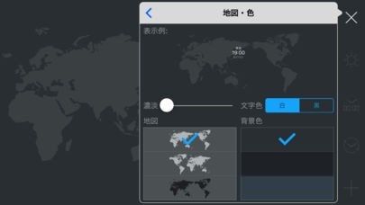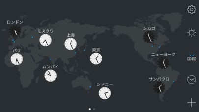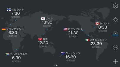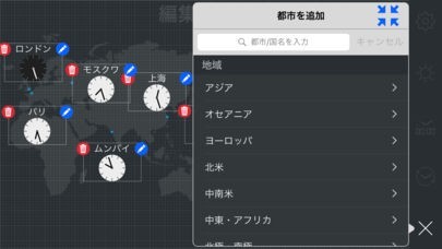 画面上の世界地図上にそれぞれの国の主要都市の時間を表示することができます。600都市の中から好きな都市を選んで自分好みに配置できるので、必要な場所の時間だけ確認できます。