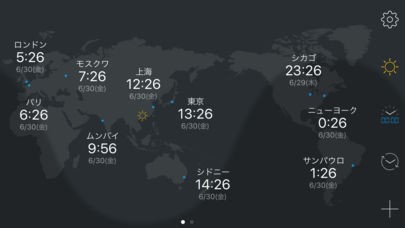 メルカトル図法を使った世界地図が画面上に表示され、アメリカ、日本、イギリスなど特定の国の時刻も一緒に示されているため、一目見るだけで良く、とても使い勝手が良いです。