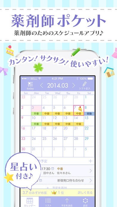 「薬剤師ポケット」は、薬剤師やその他シフト制で働く職業に就いていて仕事のスケジュールを特にしっかり管理したいという人のためのアプリです。月ごとのスケジュール一覧は表形式のカレンダータイプと縦一列に並んだリストタイプの好きな方を選べます。シフト予定の入力は、早番・遅番・夜勤など勤務時間がプリセットされたシフト専用スタンプをタップするだけなのでサッと簡単にでき、スタンプごとの時刻設定もカスタマイズ可能、一緒にシフトに入るメンバーを入力することもできて便利です。もちろんシフト以外にも任意の予定を登録でき、スタンプの種類も「仕事」、「外出」、「イベント」などテーマ別に豊富に用意されていて、予定の種類がひと目でわかるようになっています。