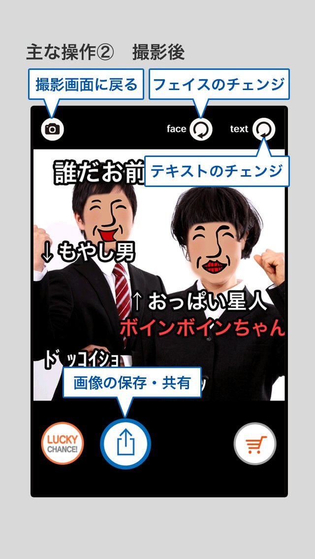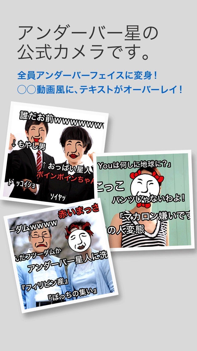 App Storeより引用ネットカルチャーが生み出したスーパーエンターテイナー、__(アンダーバー)がついにApp Storeに進出。誰を撮影しても顔がアンダーバーになってしまう、驚愕のアンダーバー星人増殖カメラ。ニコ動風コメントも表示。その名も、フォトダーバー。