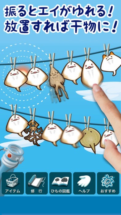 アイテムを使うことで様々な干物を作ることができます。素材のエイとの相性を考えて組み合わせることで効き目も変わります。アイテムで可愛いエイや変なエイ、様々なエイをコンプリートしましょう!